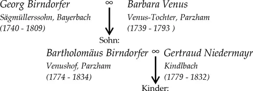 Georg Birndorfer, aus einer Sägemühle in Bayerbach stammend, heiratete 1767 Barbara Venus vom Venushof in Parzham, wo das Paar sein Leben lang den Hof bewirtschaftete. Auf diese Weise kam der Name „Birndorfer“ auf das Gut und wurde weitergegeben durch Bartholomäus, den Sohn der beiden. Er heiratete als 26jähriger die fünf Jahre jüngere Gertraud Niedermayer aus dem nahegelegenen Kindlbach. Ihre beiden Großmütter waren Schwestern gewesen, sodass für die Hochzeit am 24. Juli 1800 der kirchliche Dispens erforderlich war.53 Als Traupriester wirkte Vikar Thomas Zängl, als Trauzeuge der Schulmeister Nachreiner.54