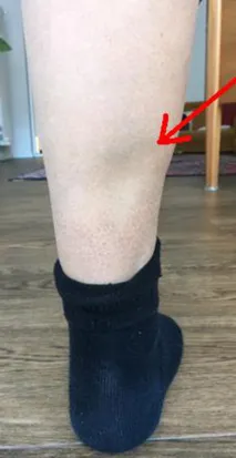 Abb. 2: Am rechten Unterschenkel zeigt sich eine blaue Verfärbung und eine Eindellung, von der die Patientin behauptet, dies schon immer zu haben. Vielfach sei sie von Freunden schon auf diese Besonderheit angesprochen worden. Es sehe nicht nur aus wie eine Einschürung, sondern auch das Gefühl sei so.