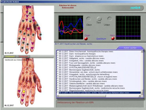 Abb. 3: Energetische Schwäche im Bereich der Hände, bei Invertierung von Handfesseln aus früherem Leben bessert sich der Befund um 69%.