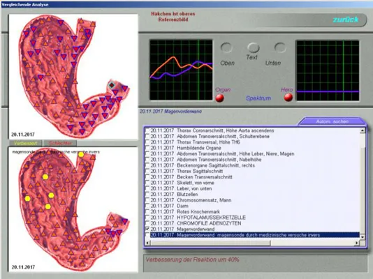 Bewertung: Beeindruckend ist, dass sich die Belastung am Mageneingang in der NLS-Analyse, klinisch als auch aurachirurgisch präsentiert und nach Auflösung des karmischen Musters der medizinischen Versuche die Resonanz am Magen bzw. an der Mundöffnung wie auch das Sodbrennen vollständig verschwinden. Zusätzlich zum karmischen Muster der Medizinischen Versuche findet sich in der aurachirurgischen Exploration bei diesem Patienten noch die energetische Belastung von Magen, Zwölffingerdarm, Dünndarm und Dickdarm in der NLS-Analyse mit Candida albicans, was im Rahmen des Sodbrennens natürlich auch eine Rolle spielt. Entsprechend wird dem Patienten empfohlen, sich einer Darmsanierung durch den Heilpraktiker zu unterziehen, wodurch sich die Symptomatik noch weiter bessern sollte.