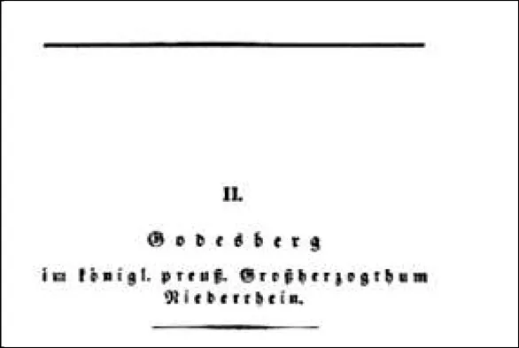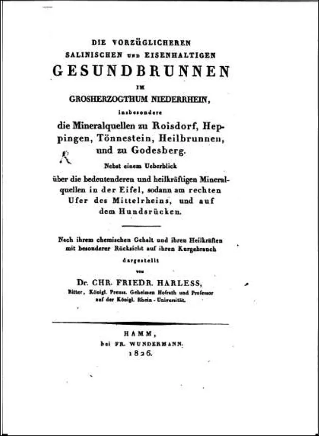 | 1826 | Johann Christian Friedrich HARLESS: Die vorzüglichsten salinischen und eisenhaltigen Gesundbrunnen im Großherzogthum Niederrhein insbesondere die Mineralquellen zu Roisdorf, Heppingen, Tönnestein, Heilbrunnen, und zu Godesberg…“ (Kapitel V. Die Mineralquellen zu Godesberg) |