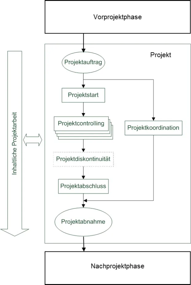 Darstellung 1 zeigt den Projektmanagement Prozess nach GAREIS im zeitlichen Kontext. Am Beginn des Prozesses steht der unterschriebene Projektauftrag, danach folgen die Projektstartphase und abhängig von der Projektdauer mehrere Projektcontrollingzyklen. Parallel dazu findet laufend die Projektkoordination statt. Das Ende des Projektmanagement Prozesses bildet die Projektabschlussphase mit der finalen Projektabnahme. Diese Teilschritte bilden das fixe Grundgerüst des Projektmanagement Prozesses. Die Bewältigung einer Projektdiskontinuität stellt eine optionale Phase dar und wird nur bei Vorliegen einer Projektkrise oder einer Projektchance durchlaufen.6 Die inhaltliche Projektarbeit findet parallel und unabhängig vom Projektmanagement Prozess statt.7 Den zeitlichen Kontext bilden die vor Beginn des Projektprozesses stehende Vorprojektphase und die nach dem Ende des Projekts befindliche Nachprojektphase.8 Eine andere Sicht auf den Projektmanagement Prozess nimmt etwa das PMI ein: Hier wird, umgelegt auf die zuvor vorgestellte Sichtweise, sowohl die Vorprojektphase als auch die Nachprojektphase als Teil des Projekts selbst gesehen.9