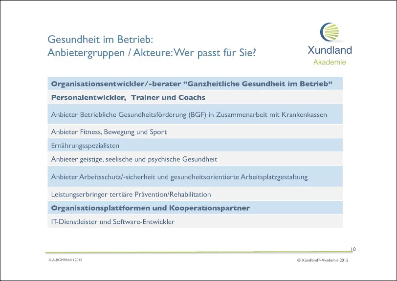 - Anbieter von Konzepten oder Bausteinen für die Einführung von „Gesundheit im Betrieb“