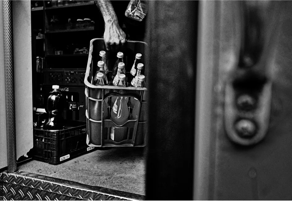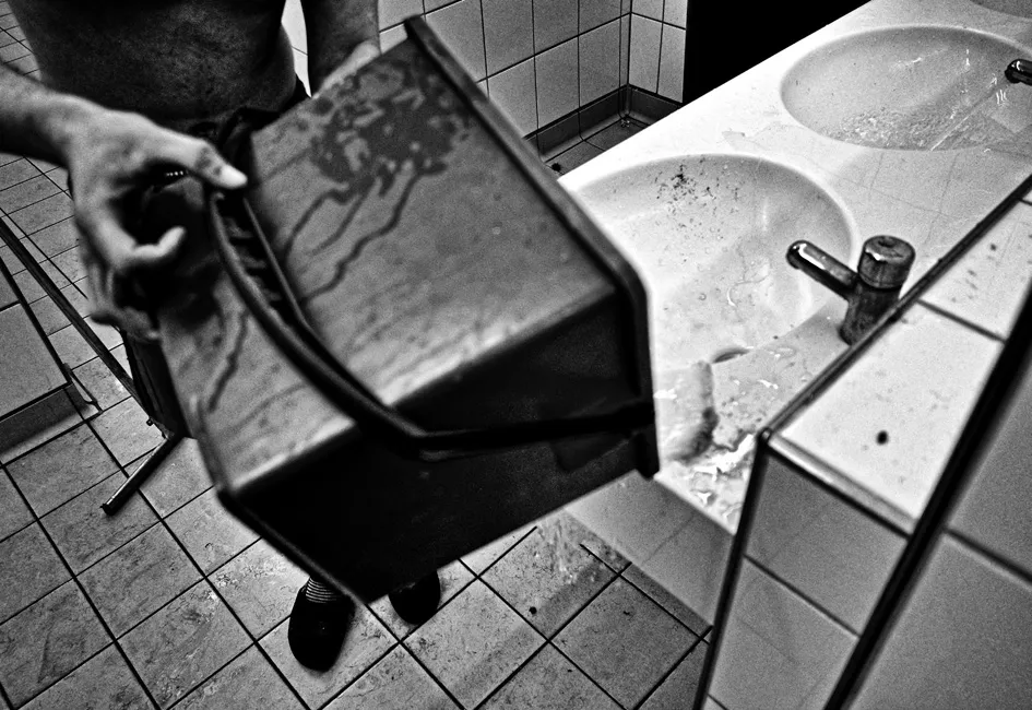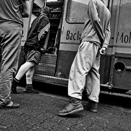 Vor wenigen Stunden noch schneite an genau dieser Stelle das Paradies herein: Der fahrende Händler, ein Kiosk auf Rädern, mit vollen Regalen. Einmal pro Woche können sich die Häftlinge mit Lebens- und Genussmitteln aller Art eindecken. Im Wagen ist es so eng, dass sie maximal zu zweit eintreten dürfen. Die anderen bilden eine Schlange von mehreren Metern und warten geduldig. Erstanden werden Getränke, die in der Kantine nicht angeboten werden, Süßigkeiten, Obst, Gemüse und Dinge, die sie dann nach Feierabend in den Gemeinschaftsküchen zubereiten. Ob er denn vorhin auch etwas gekauft habe, frage ich T.. „Nein, da kauf ich nicht! Das ist doch total überteuert“, schimpft er und schüttelt energisch den Kopf. Die Verkäuferin kaufe ihre Ware selbst irgendwo in einem Supermarkt und verkaufe sie doppelt so teuer weiter, so sein Vorwurf. „Alle bescheißen. Überall. Richter, Verkäufer, alle.“ Später wolle er Betriebswirtschaft studieren. Dann könne er selber auf hohem Niveau bescheißen. „Ich kann gut rechnen“, sagt er über sich und möchte damit seinen Plan untermauern.