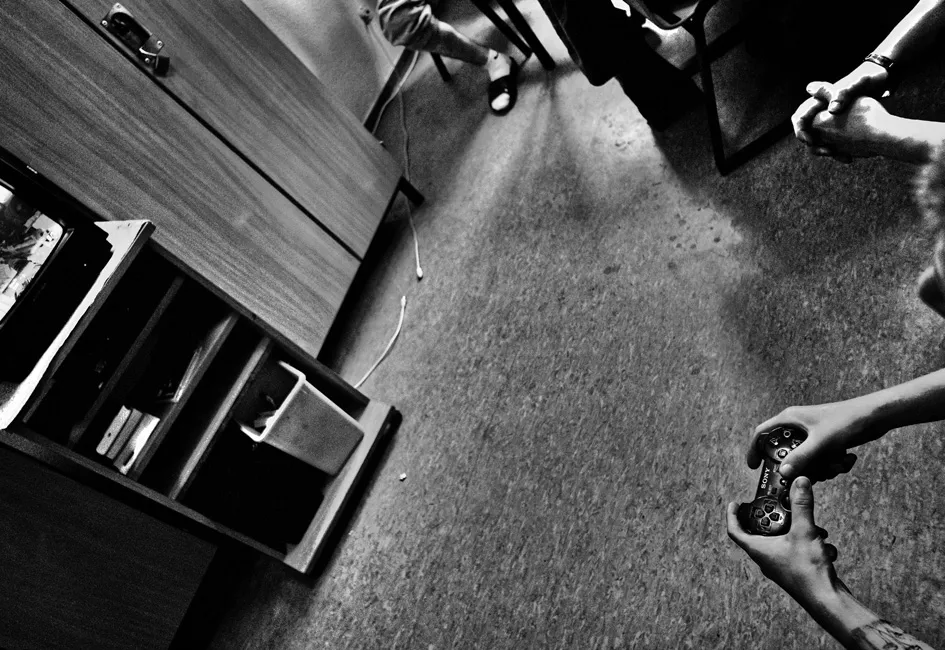 Zwei Gefangene stehen an die Wand gelehnt im breiten Flur. Von rechts nähern sich noch drei. Sie flüstern sich etwas zu, einer von ihnen nickt, während ein anderer wie beiläufig nach hinten über die Schulter blickt und sich am Nacken kratzt. Links öffnet sich eine Tür. Heraus kommen zwei weitere Häftlinge, breitbeinig, den Kopf hängend, aber den etwas nicht! Sofort springen sie auf. Innerhalb von Sekunden könnten sich jetzt die Aggressionen in einer wilden Prügelei entladen. „Schwirrt ab!“ Klare Ansage. Das harsche Kommando eines der Bediensteten hallt über den Flur. In Verbindung mit einer Armbewegung, wie man sie vom Boxen her kennt, ein Zeichen des Auseinandergehens, weichen die Blick nach oben gerichtet. Stress liegt in der Luft. Kontrahenten? Offene Rechnungen? Ihre plötzliche geballte Präsenz, das maskuline Gehabe und die Positionen der Männer zueinander, wirken massiv bedrohlich. Jetzt wird es eng im breiten Flur, das spüren die Bediensteten sofort. Von ihrem Büro aus haben sie alles im Blick -und hier stimmt Häftlinge zurück. „Das Land NRW hat Millionen in eure Hafträume investiert. Ihr müsst also nicht auf dem Flur abhängen!“ Das Gelächter ist nur kurz. Die Häftlinge spüren, der Spruch enthält eine sehr ernste Botschaft. Und so verströmt die Horde schnell wieder in die Zimmer des Flures: Direkt zurück in ihre Hafträume, zum Kicken in den Gesellschaftsraum oder zum Frisieren ins Bad. Wen es heute Abend in die Teeküche verschlagen hat, will nicht kochen oder backen. Heute Abend heißt es „rappen“. Und böse gucken. Aus einem CD-Spieler dröhnt jetzt ein Mono-Beat. Ghetto. „Pscht“, flüstern sie, „aber nicht so laut! Wenn jetzt einer kommt, gibt‘ s richtig Ärger! Hier dürfen höchstens vier Leute rein.“ Okay-kleines Ghetto.