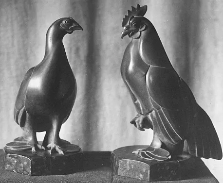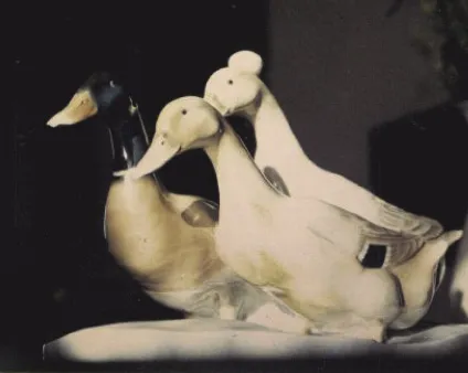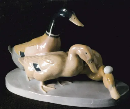 Noch wirkungsvoller ist die schlanke indische Laufente in der bezeichnenden hoch aufgerichteten Stellung dieser Rasse; Hutschenreuther hat sie in Porzellan, bemalt in den Naturfarben des Erpels (grüner Kopf, weißer Halsring und graues Gefieder), vervielfältigt. Was mag so ein Stück in hundertundfünfzig oder zweihundert Jahren für Sammler und Liebhaber wert sein …?