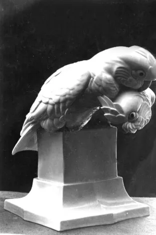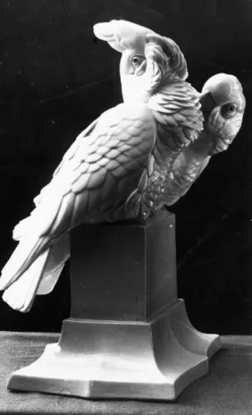Vor allem müssen die Tierplastiken in Porzellan hervorgehoben werden, und hiervon wiederum zwei Enten-gruppen von Wilhelm Krieger, die in ihrer naturgetreuen Auffassung und vorzüglichen Ausführung eine hervorragende Leistung auf dem Gebiete der Porzellanplastik darstellen. Die eine Gruppe zeigte auf matt grauer Platte drei farbig ausgeführte Enten, die in der zarten Farbenabstimmung vorzüglich wirkten, die andere Gruppe, ebenfalls auf matt grauer Platte, war in Weiß gehalten, nur Schnabel und Schwimmhäute leicht getönt.