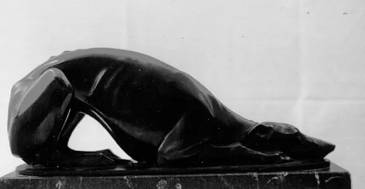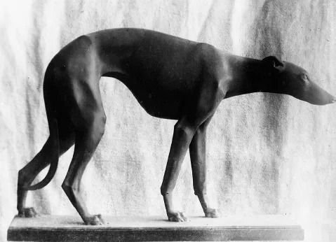 Einen Vierfüssler möchte ich aber doch noch aus seinen Werken vorführen, und zwar den Windhund, weil dieser mir so ganz besonders bezeichnend die strenge und zugleich feine Auffassungs- und Schaffensweise des Künstlers zu veranschaulichen scheint. Man verfolge nur einmal aufmerksam die Linien, Kanten und Flächen, die er an dem schlanken, leichten Windhundkörper angibt! Alles groß und ruhig, streng und einfach. Ich möchte glauben und sagen: eine Freude ebensowohl für den Kunstfreund wie für den Hundekenner. Es fehlen viele Einzelheiten, die sehr zur ›Belebung‹ des Ganzen dienen könnten; es fehlt aber nichts Wesentliches. Und, was – mir wenigstens – das Entscheidendste ist: es wird nirgends durch zügellosen künstlerischen Eigenwillen der Natur, der natürlichen Erscheinung und dem tatsächlichen Wesen des Tieres Gewalt angetan. Die Impression, die Empfindung des Künstlers ist natürlich und bleibt in natürlichen Grenzen.