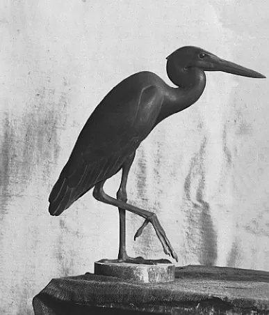 Schließlich stand Kriegers Künstlerverlangen auch nach dem Reiher. Ich konnte ihm einen liefern und war begierig, wie er sich mit diesem steifen, stelzigen Neidhart und Grimbart unter den Vögeln auseinandersetzen würde. Nicht lange, so schickte er mir die Aufnahme des Gipsabgusses, und ich konnte mich überzeugen, daß er in seinem Stil auch aus diesem Vogel-Ekel etwas Anziehendes zu machen weiß. Scharf gekennzeichnet in einer Eigenart durch Haltung und Umriß, steht der lauernde Fischräuber da, in Bereitschaft zu federndem Vorstoßen des Schnabels, den leeren Hals zurückgerichtet an der einzigen Stelle, wo dies durch besondere Festhaltung der Halswirbel möglich ist; das eine Bein mit dem langzehigen Fuße halb erhoben wie zum sachten Weiterschreiten im seichten Wasser. Bein und Fuß sind höchst lebendig, auch ins Einzelne gehend ausgearbeitet mit allen ihren feineren Linien und Kanten, weil der Beschauer das unbewußt von diesen frei dem Auge sich darbietenden Teilen verlangt. Dagegen ist das am lebenden Vogel glatt anliegende Gefieder auch im Abbild ganz glatt gehalten, kaum in Felder geteilt; nur wo der zusammengelegte Flügel sich in die Schulter einsetzt, ein auffallender Einschnitt – eben an der Stelle, wo auch in Wirklichkeit immer einer zu sehen ist.