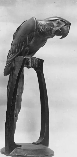 Vor allem fesselte mich ein Pärchen federfüssiger Zwerghühner. Von weitem schon für den Kenner kein Zweifel, welcher Rasse angehörig, und doch, wenn man näher zusah, wie einfach war das alles gemacht! Da war von dem weicheren Kleingefieder überhaupt nichts im einzelnen angegeben, nur die großen, harten Kielfedern der Flügel, des Schwanzes und der Latschen an den Füssen; die aber auch mit aller nur wünschenswerten Klarheit und Deutlichkeit. Der ganze eigentliche Vogelkörper war in große, glatte von scharfen Linien umrissene Flächen eingestellt … Sehr schnell … merkte ich, wie natürlich diese Flächen den tatsächlichen Gefiederflächen entsprachen, wie feinfühlig diese Linien den sichtlichen Grenzen der Gefiederfelder nachgezogen waren. Schwer war es bei dem Zwerghühnerpärchen, loszukommen von der schläfrigen Behaglichkeit des Hähnchens und der lässigen, man möchte sagen: echt weiblichen Grazie des Hühnchens, von diesem stillen, inneren Leben … eine wahre Feinschmeckerei! Aber sie wiederholte sich, als der Blick auf den Bronze-Ara fiel, der da in der Nähe auf seinem Bügel hockte, ganz in der gebückten Haltung und mit dem beobachtenden Blick, wie man das von diesen großen Papageien kennt. Auch da nur Federn angegeben, wo es nicht ohnedem geht, wo ohnedem die Natur zur Unnatur vergewaltigt würde; wo aber Federn gemacht sind, da sind sie auch richtig gemacht und sitzen richtig. Und der eigenartige, hübsche Bügel, den die Kletterfüsse so lebendig - fest u...