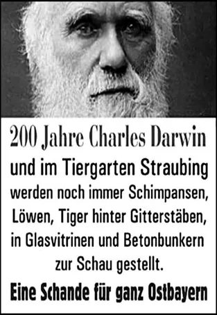 Erwartungsgemäß gibt es erbitterten Widerstand gegen das Ansinnen, die Straubinger Schimpansenhaltung zu beenden, vor allem seitens lokaler Politiker, Medienvertretern und Geschäftsleuten, die immer schon mit dem Zoo als Werbepartner paktieren. In der Tat, wie Volker Sommer schreibt, „halten uns Affen den Spiegel vor. Es diente unserer Selbsterkenntnis ungemein, dass Charles Darwin 1871 behauptete, der Mensch stamme vom Affen ab. Damit stellte er jenes Schema auf den Kopf, wonach der von Gott engelsgleich erschaffene Mensch durch die Sünde zu Fall kam. Darwin kehrte den «Abstieg von den Engeln» um in einen «Aufstieg von den Affen», machte aus einer eher schmeichelhaften «Devolution» eine ernüchternde «Evolution». Noch immer fühlen sich Menschen hierdurch in ihrer Würde verletzt, sehen sie Affen doch als Karikaturen, als unvollkommene Entwürfe für die Krone der Schöpfung. Und Geisteswissenschaftler postulieren noch immer dogmatisch einen unüberbrückbaren Graben zwischen «dem Tier» und «dem Menschen». Dabei kann es so faszinierend sein, sich dem Evolutionsgedanken radikal zu öffnen, sich als lediglich eine besondere Art von Tier zu begreifen. Für mich ist es nicht erniedrigend, sondern erhebend, mit allen anderen Lebensformen verbunden zu sein durch einen äonenalten Strom von Generationen.“76