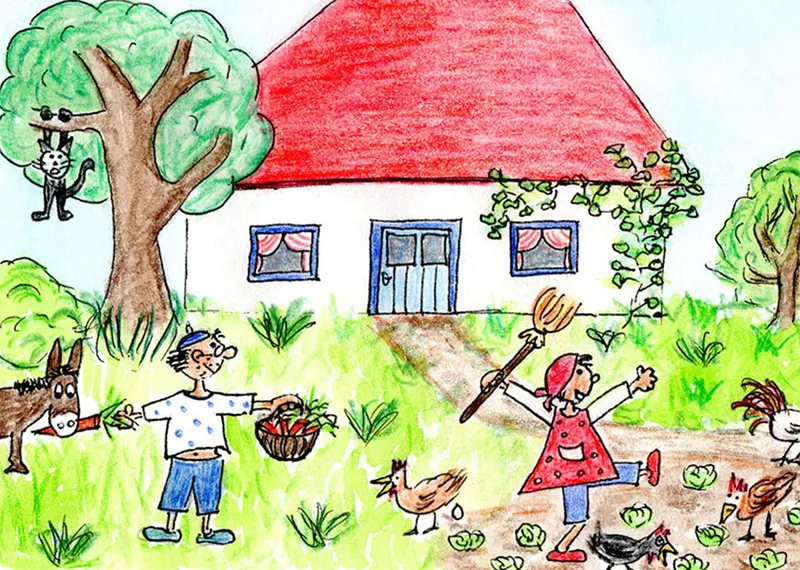 Hannah, Emma, Carl und Klein Emil sind bei Oma und Opa zu Besuch. Sie wohnen auf dem Land und haben einen ganz großen Garten mit vielen Gemüsebeeten. Dann gibt es noch einen Esel. Das ist schon eine ältere Dame, die Trude heißt und schon 21 Jahre bei Oma und Opa wohnt.