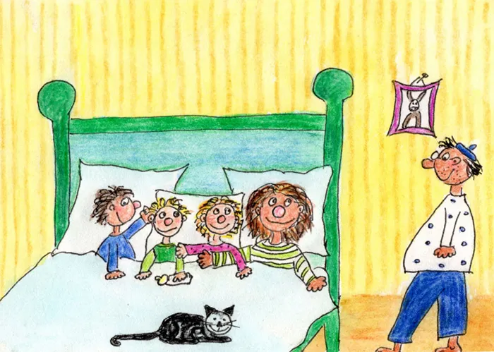 Abends liest Oma Kindergeschichten vor und danach kommt Opa ins Zimmer und sagt: „So Kinder, eine gute Nacht – behüte euch Gott.“