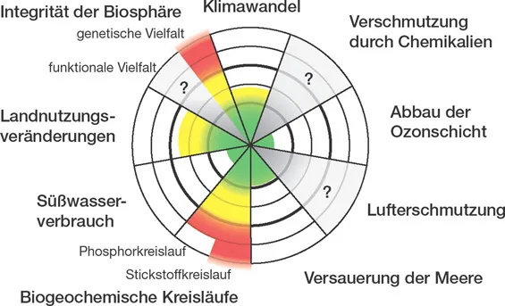 In dem Buch „Planetary Boundaries: Exploring the safe operating space for humanity” haben Rockström u. a. neun „planetarische Lebenserhaltungssysteme“, die nahezu alle primär ökologischen Charakter tragen, behandelt. Unter diesen „Kontrollvariablen“ wird die „Integrität der Biosphäre“, mit der sich dieses Buch beschäftigt, für das Überleben der Menschheit als besonders wichtig, aber zugleich auch als hochgefährdet angesehen. Die „genetische Vielfalt befindet sich nach dieser Grafik (siehe umseitige Abbildung 1) bereits im „Hochrisikobereich“. Auch fehlen noch die Voraussetzungen, um die „Belastungsgrenze“ quantifizieren zu können. Ihre Kenntnis ist jedoch erforderlich, wenn man bei weiteren Eingriffen in die Biodiversität unabsehbare Folgen vermeiden möchte.