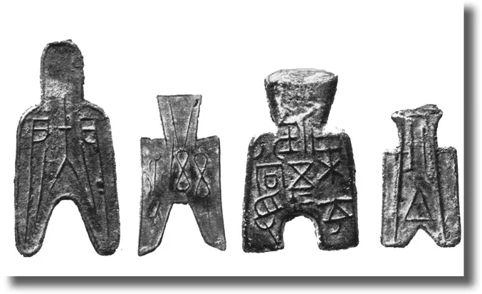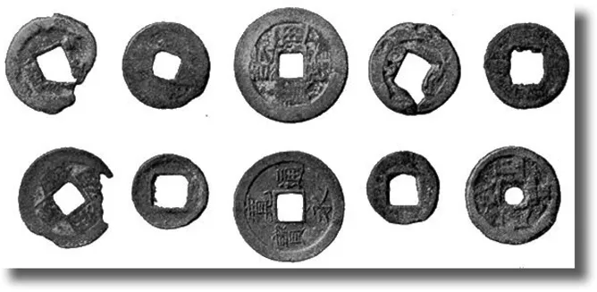 Nun führt der Kaiser neue Münzen ein, die fortan im ganzen Reich gelten. Es sind runde Gold- und Bronzemünzen mit einem quadratischen Loch in der Mitte, damit man die Geldstücke auf Schnüre aufreihen kann. Diese Form wird in China noch bis ins 20. Jahrhundert nahezu unverändert beibehalten.