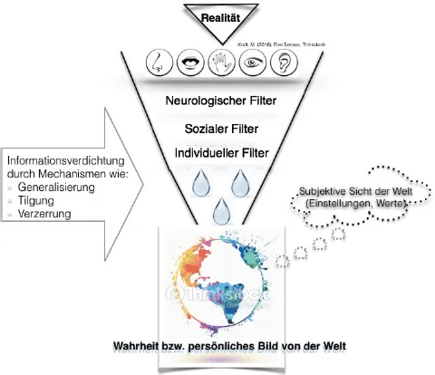Als Basis der Wahrnehmungspsychologie dienen zunächst die Sinne des Individuums. Dabei werden nach dem Existentialismus (über die Vermittlung der Sinnesorgane) Wirklichkeiten der ersten Ordnung wahrgenommen. Nach den Erkenntnissen des radikalen Existentialismus werden Filter gesetzt, welche die Realitätswahrnehmung des Individuums, auch als deren selektive Wahrnehmung manipulieren. Diese beeinflussen das Individuum entsprechend und nehmen gleichzeitig Einfluss auf dessen Beurteilung der Realität und „Wahrheitskonstruktion“ (siehe dazu Abbildung 1).