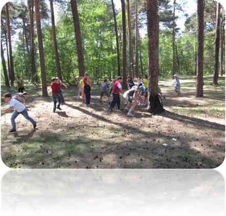 „In meinen Händen halte ich diese Untersetzer und damit passiert Folgendes. Jede Gruppe bekommt einen gleich großen Stapel. Diesen jeweiligen Stapel werde ich im jeweiligen Spielfeld auf dem Waldboden Verteilen. Auf der einen Seite des Seiles ist ein Spielfeld und auf der anderen Seite logischerweise ebenfalls ein Spielfeld. Beide zusammen ergeben ein großes Spielfeld und das Seil in der Mitte dient ausschließlich als Markierung.