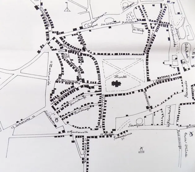 Kleinheide, die Bezeichnung Lüttenheid gab es erst im 20.Jahrhundert, und Groths Mühle, die am Anfang der Feldstraße lag, bildeten das südliche Ende des Fleckens. Es gehörte zur Österegge. Auf dem Stadtplan von 1840 (Seite 6) ist die damalige Bebauung des Ortes gut zu erkennen.