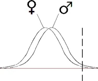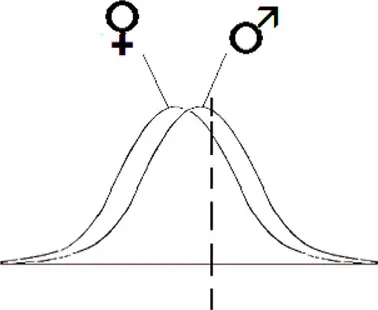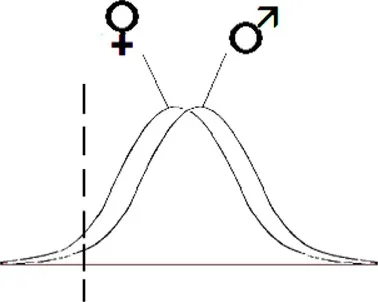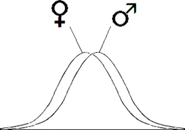 Warum wird Autismus unter Vertretern des männlichen Geschlechts öfter diagnostiziert und warum scheint heute der Anteil weiblicher Autisten höher zu liegen als noch vor einigen Jahren? Dazu hätte ich auch eine steile These anzubieten: Eine mögliche Antwort könnte sein, dass Autismus überhaupt nicht oder kaum häufiger auftritt als früher, sondern dass sich die Kriterien verschoben haben, oder anders ausgedrückt, dass der Abstand vom Durchschnitt, ab dem jemand als Autist eingestuft wird, kleiner geworden ist. Vielleicht sind Jungs von Haus aus einen Tick autistischer als Mädchen, etwa wie in folgender Graphik dargestellt.