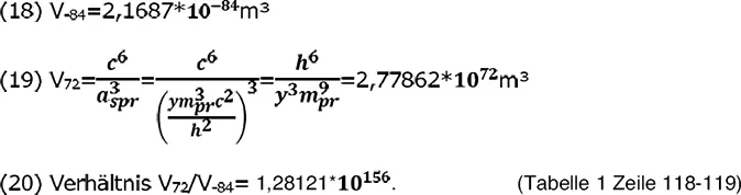 Setzt man für aspr die Schwerefeldbeschleunigung des Proton im Quantenraum, die Beschleunigung der Trägheit des Proton im Quantenraum atpr ein, so ergibt sich das Volumen