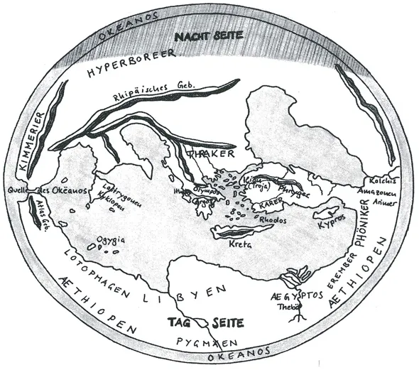 Die Erde umfasste im wesentlichen die bekannten Staaten und Zivilisationen des Mittelmeerbeckens. Hier ereignete sich die sogenannte Weltgeschichte, ungeachtet anderer Völker im hohen Norden und fernen Osten. Erde ist die bewohnte, kulturierte Welt, deren Grenzen („die Enden der Erde“) Wüste, Meer, sowie grauer Nebel, Gebirge, Eis und Schnee im Norden bilden. Das war der Welt-Raum. Hoch im unbekannten Norden grenzte die bewohnte Welt an das Nebelhaft-Dunkle, Un-heimliche, das Reich der Finsternis.