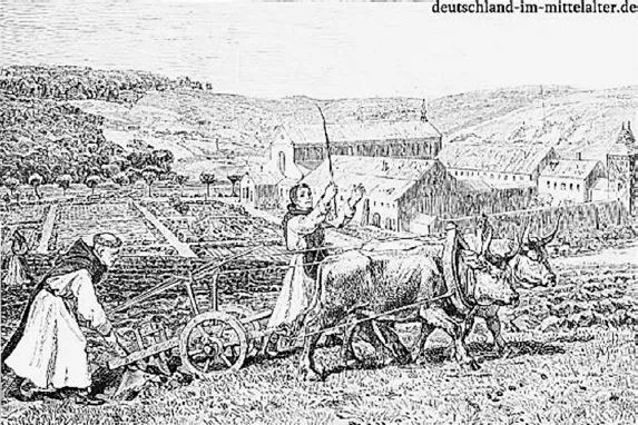 Abbildung 1: Mönche als Landbauern mit Pflug und Ochsengespann bei der Feldarbeit. Quelle: Zeichnung Wilhelm Riefstahl (1827–1888)