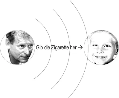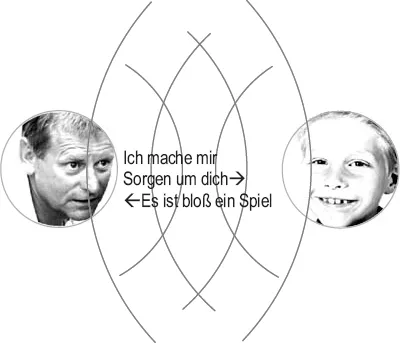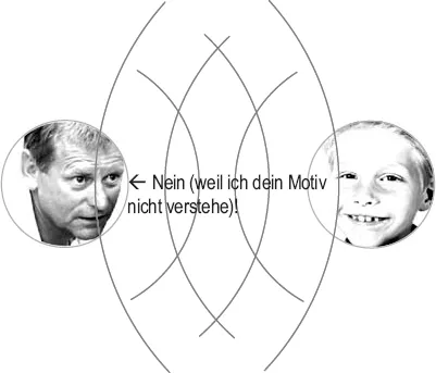Konfrontation können wir uns also als Folge einer Störung der Kommunikation vorstellen: Der Vater hat eine gut gemeinte „Botschaft“ gesendet, die Thomas zwar hört, aber deren Ursache und Sinn er nicht verstehen kann, weil der Vater seine Motive verschweigt. Dabei hat er sich nach seiner Meinung durchaus in den Sohn eingefühlt: Er hat sich sogar mit Thomas identifiziert, als liefe er selbst Gefahr, zum Kettenraucher zu werden. Statt positiver Resonanz entsteht eine verhängnisvolle Symbiose, der Nährboden für Konfrontation4.