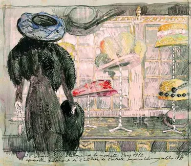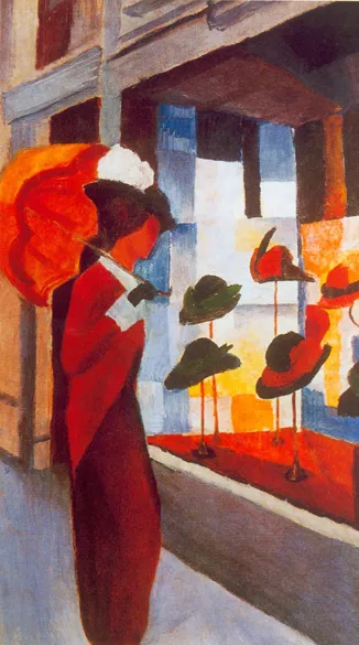 August Mackes Gemälde Hutgeschäft (1913) darf, auf die andere Seite der modebewussten Konsumentin schauend, als Visualisierung desselben Themas aus persönlicherer Perspektive gesehen werden. Das Bild kann, gemeinsam mit weiteren Einzelbeispielen, stellvertretend für eine große Anzahl künstlerischer Abbildungen aus den Jahrzehnten um 1900 stehen, die Frauen vor dem Schaufenster des Hutgeschäftes in der spezifischen Situation des möglichen Hutkaufes zeigen, mit allen Konnotationen von modebezogener Emotionalität, die damit in Verbindung gebracht werden.100