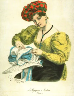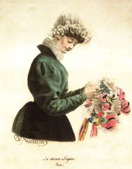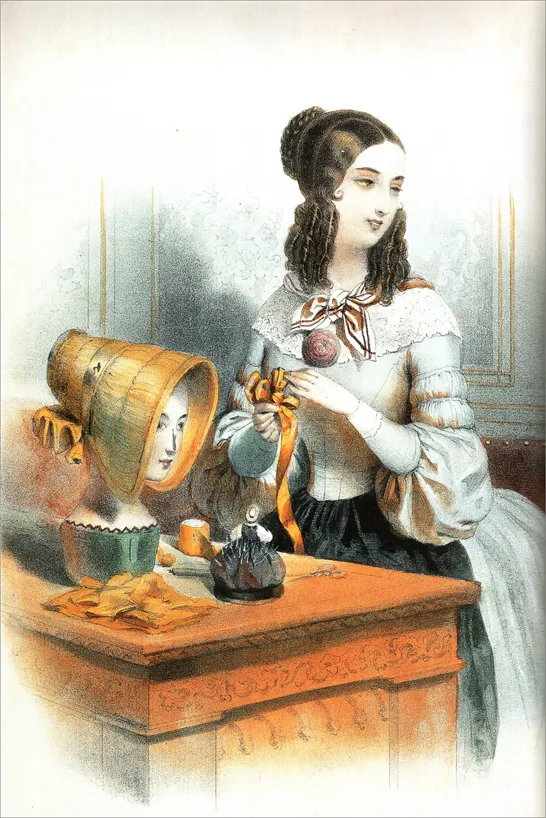 Die nur wenig jüngere Modistin auf einer weiteren, um 1840 entstandenen Lithographie (Abb. S. 98) fasst als klassische Frauenabbildung des Biedermeier bereits einige der zuvor genannten Aspekte zusammen. Die nunmehr halboffen zur Seite blickende Putzmacherin garniert eine modezeittypische Schute, die zu ihrer eigenen Haartracht mit Korkenzieherlocken und Knoten gut zu passen scheint. Was hier bereits als Bild mit sehr klischeehafter Anmutung angelegt ist, wird sich später als durchaus traditionsbildend erweisen in Nachahmung und Abwandlung.