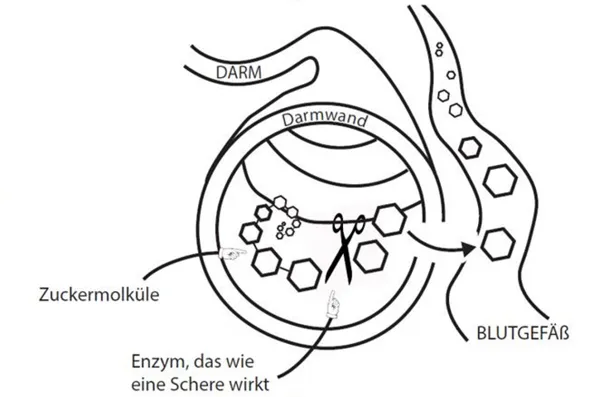 Unsere Nahrung besteht hauptsächlich aus den drei Stoffgruppen Kohlenhydrate, Eiweiß und Fett (Siehe Kapitel 7). Wenn wir etwas essen, wird der Kohlenhydratanteil von dem Enzym Amylase2 im System des Verdauungstraktes in einzelne Zucker-Moleküle zerlegt. Diese können dann durch die Dünndarmschleimhaut aufgenommen werden, sodass sie ins Blut übertreten. Unter allen Zuckermolekülen, die so resorbiert werden, ist für uns die Glukose der in seiner Wirkung bedeutsamste Zucker. Er ist beispielsweise Teil des Haushaltzuckers, den wir in der Küche verwenden oder vielleicht, um bei Tisch unseren Kaffee oder Tee zu süßen, und er ist in der Stärke in Kartoffeln und Brot enthalten.