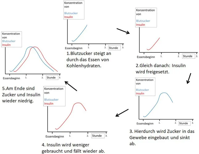 Abb. 3: Regulation des Blutzuckerspiegels: Mit Anstieg des Zuckers im Blut nach der Verdauung erscheint Insulin im Blut und senkt den Blutzucker wieder auf normale Werte. Mit der Senkung des Zuckers geht auch die Insulinkonzentration zurück.