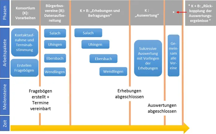Als Anwendungskommunen mit bereits existierenden Bürgerbusverkehren konnten im Landkreis Göppingen die Gemeinde Salach, die Städte Uhingen sowie Ebersbach und im Landkreis Esslingen die Stadt Wendlingen am Neckar gewonnen werden. Das Projekt hatte eine Laufzeit von Juli 2014 bis Dezember 2016 (30 Monate).