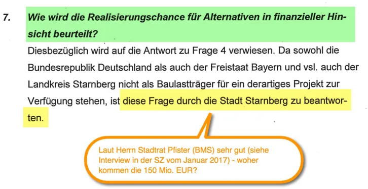 Ich vermute, dass uns diese Frage, wie denn die Stadt Starnberg 150 Mio. EUR aufbringen soll, nur die BMS beantworten kann. Denn nach Aussage von Herrn Pfister stehen die Chancen in finanzieller Hinsicht ja sehr gut.