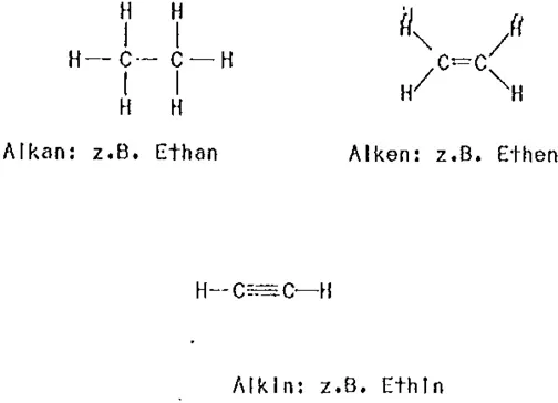 Der Unterschied zwischen Alkanen, Alkenen und Alkinen liegt in der Bindungswertigkeit zwischen zwei benachbarten Kohlenstoffatomen. Diese drei Stoffgruppen bilden sog. „homologe Reihen“, d.h. jedes Molekül, welches zu einer dieser Stoffgruppen gehört, setzt sich nach einem bestimmten Schema aus Kohlenstoff und Wasserstoff zusammen.