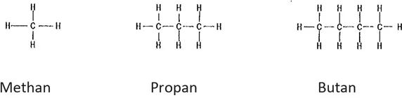 Betrachtet man die Strukturformeln von Methan, Ethan (s.o.), Propan und Butan, so erkennt man den einheitlichen Aufbau.
