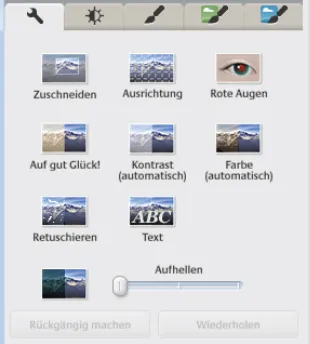 Bildausschnitt wählen (Zuschneiden), Bild schwenken (Ausrichten), rote Augen entfernen (Rote Augen), automatische Korrektur von Farbe und Kontrast (Auf gut Glück!), Kontrast oder Farbe automatisch verbessern, Flecken entfernen (Retuschieren), Text hinzufügen (Text), jedes Pixel aufhellen (Aufhellen.