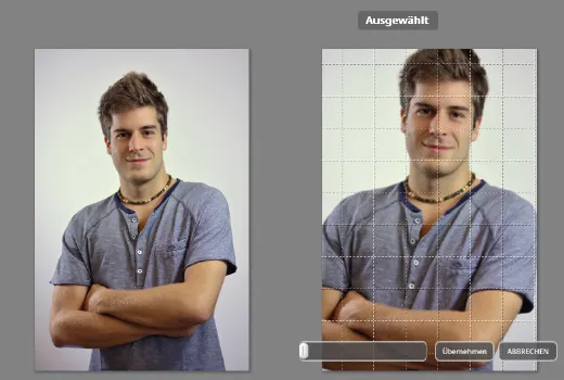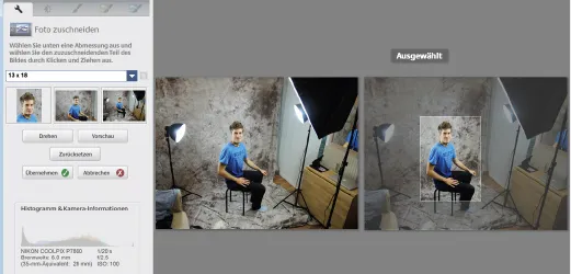 Klicken Sie auf „Zuschneiden“ und wählen Sie danach die gewünschte Bildgröße für die Ausgabe aus. Klicken Sie auf eine der Hochformat- oder Querformat- Vorlagen. Es erscheint in der Vorschau ein hellgraues Rechteck, das Sie nun durch „klicken, halten und Maus bewegen“, in der Mitte des Rechtecks, verschieben können, bzw. an den Eckpunkten des Rechtecks in der Ausschnitt-Größe verändern können. Klicken Sie weiter auf den Button „Vorschau“, um das Ergebnis zu kontrollieren und, wenn es passt, auf übernehmen.