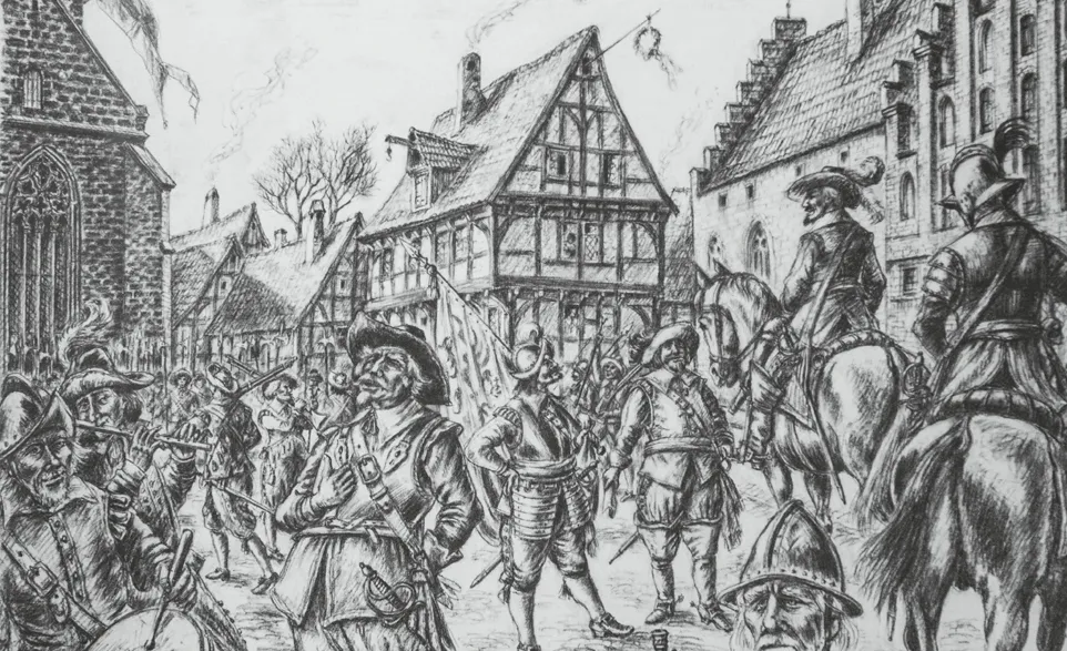 1639 begegnen wir zum ersten Mal dem Begriff „Stadtoffizier“, das heißt einem Offizier aus der Bürgerschaft. Bis zu diesem Zeitpunkt, also vor Beginn des 30-jährigen Krieges, waren die Hauptleute und Leutnante Berufssoldaten. Nun aber haben Bürger die Führung des Bürgeraufgebotes für Wachen, Bollwerk und den Feuerlöschdienst selbst als Offiziere übernommen.