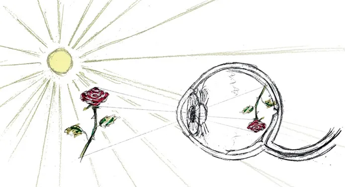 Die Sonne schickt Lichtstrahlen zur Erde. Diese werden bei deren Auftreffen auf der Erde teilweise absorbiert (vom betroffenen „Gegenstand“ aufgenommen) und teilweise reflektiert (zurückgeworfen). Das reflektierte Licht dringt durch deine Pupille ins Auge ein. Kopfüber fällt es danach auf deine Netzhaut.