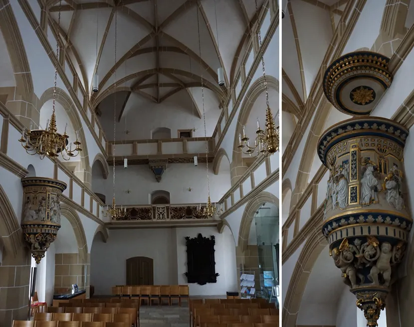 Friedrich der Weise beauftragte Luther persönlich, seine neue, reformierte Kirche nach den Vorstellungen und Erkenntnissen von Luther hier, direkt in seinem Residenzschloss zu bauen. Hierzu gehörte für Luther vor allem die Kanzel, die inmitten der Gemeinde stehen sollte, was hier gut zu erkennen ist. Denn das Wort Gottes stand für Luther im Mittelpunkt.