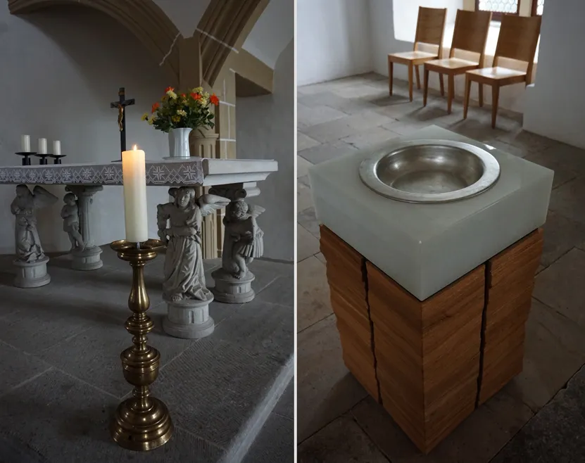 Ebenso findet man am Eingang keine Weihwasserschale, keine Kniebänke im Innenraum, keine Hostie mit Tabernakel und keine Messdiener. Den Abendmahltisch als Altar zu bezeichnen, lehnte Luther ab. Vielmehr sollte das Abendmahl als Gedächtnismahl gefeiert werden, in Erinnerung an das Leben und den Tod Jesu.