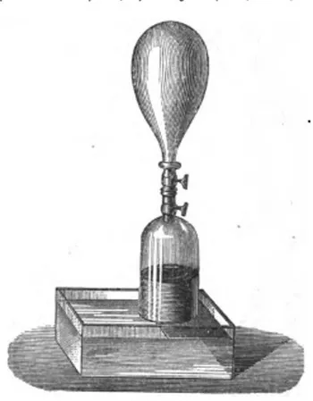 Ich habe schon öfters die Frage von Euch gehört und mich darüber wirklich gefreut: „Wie wiegt man denn Gase?“ Ich will‘s Euch zeigen. Es ist ganz einfach und leicht. Hier habe ich eine Waage und hier eine kupferne Flasche; diese ist so dünn und leicht als möglich gemacht, doch so, dass sie noch ganz fest und luftdicht ist, wie sich‘s auf der Drechselbank recht hübsch ausführen lässt; sie ist mit einem Hahn versehen, den man leicht schließen und öffnen kann; jetzt aber steht er offen, lässt also die Luft frei in die Flasche eintreten.
