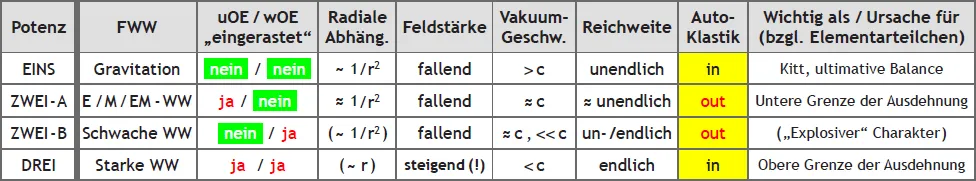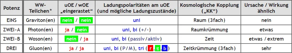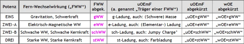 Wie (vorhin) versprochen kommen wir jetzt zu den einzelnen „wETs“, den wirkungsartigen Elementarteilchen. Ich möchte die(se) „Austauschteilchen“ (der 4 FWWs) anhand der bereits bekannten Tabelle näher beleuchten.