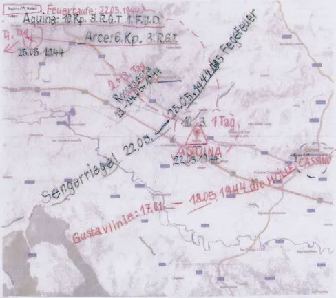 Am nächsten Tag befanden wir uns in einer Bergregion, die höher als das zerstörte Kloster lag. Von einem Hauptfeldwebel wurden wir informiert, dass wir jetzt der 10. Kompanie des 3. Fallschirmjägerregiments (FJR) angehörten. Die Führung vorort hatte es wohl schwer, uns gleich nach vorne zu bringen und so war noch Zeit, unsere Kenntnisse in Angriff und Verteidigung zu vertiefen. Einmal haben wir inne gehalten und zugesehen, wie es auf dem Monte Cassino besonders hart zuging. Wir haben die Jagdbomber und was sie angerichtet haben von oben gesehen. Aus meiner jetzigen Kenntnis war es der 18.05.1944, der letzte Tag von den vier Monte Cassino - Schlachten. Aber, dass es danach genau so weiter ging, kann ich nachfolgend bestätigen.