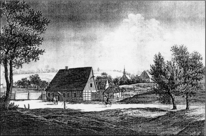 Hinter dem Gebäude des »Sandkrugs« ist in der Mitte des Bildes die Glienicker Fachwerkkirche von 1705 zu erkennen (Zeichnung von 1740).