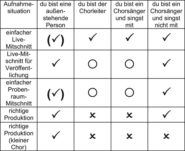 Liest du das Buch als jemand, der sich über Choraufnahmen informieren möchte, ohne dass es um Aufnahmen eines eigenen Chores geht, dann hast du am wenigsten Probleme. Als außenstehende Person kannst du dich voll auf die Aufnahme konzentrieren, wobei du für einfachere Mitschnitte sicher nicht unbedingt angeheuert wirst.