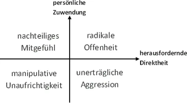 CEO-Coach Kim Scott hat vier verschiedene Führungsverhalten gefunden, die sie zweidimensional beschreibt (siehe Grafik). Die Dimensionen sind die Zuwendung, die der Vorgesetzte bereit ist, seinen Mitarbeitern zukommen zu lassen und die Direktheit des Kommunikationsstils, den er pflegt. Sie nennt das "herausfordernde Direktheit".