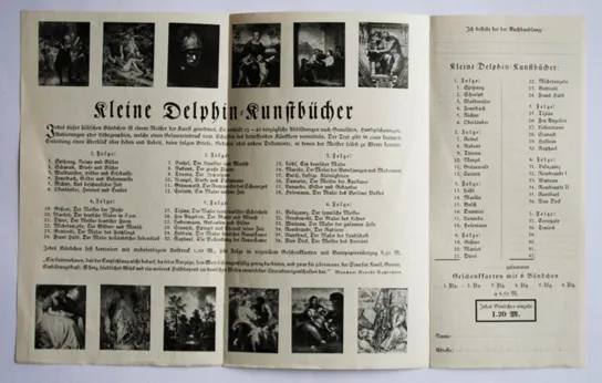 Zu Beginn führte die Reihe den Namen Delphin Bücher, später hieß sie Delphin Kunstbücher und bald erschien sie unter dem endgültigen Namen Kleine Delphin-Kunstbücher. Ein letzter Prospekt der Kleinen Delphin-Kunstbücher enthält alle 36 jemals erschienenen Bände und ist kurz vor der Beendigung der Reihe gedruckt worden, oder vorsichtiger ausgedrückt: jedenfalls kurz nach dem Erscheinen des letzten Bandes. Sechs Folgen mit jeweils sechs Bändchen bilden die komplette Buchreihe, denn die beiden Bände 37 und 38 sind, als Beginn einer geplanten siebten Folge, nur noch angekündigt, aber nicht mehr realisiert worden (über die Maler Correggio und Teniers).