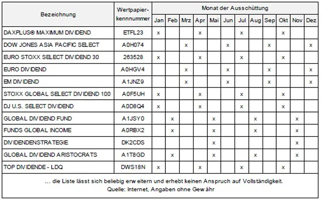 Die Tabelle zeigt beispielhaft eine Auswahl von ausschüttenden Dividendenfonds. Die Kreuze in den Monatsspalten zeigen die aktuellen Ausschüttungsmonate. Die hier genannten Fonds sollen keine Anlageempfehlung darstellen, sondern nur das Vorgehen beim Aufbau der Strategie veranschaulichen. Am Ende entscheiden Sie persönlich, welche Produkte in Ihr Depot aufgenommen werden.