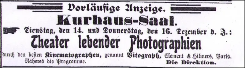 Am Dienstag, den 14. und Donnerstag, den 16. Dezember 1897 gastierte im Wernigeröder Kurhaus (ab 1935: »Stadtgarten«) das »Theater lebender Photographien durch den besten Kinematographen, genannt Vitograph, Clement & Hilmers, Paris«, wie es in der Ankündigung im »Wernigeröder Tageblatt« hieß.